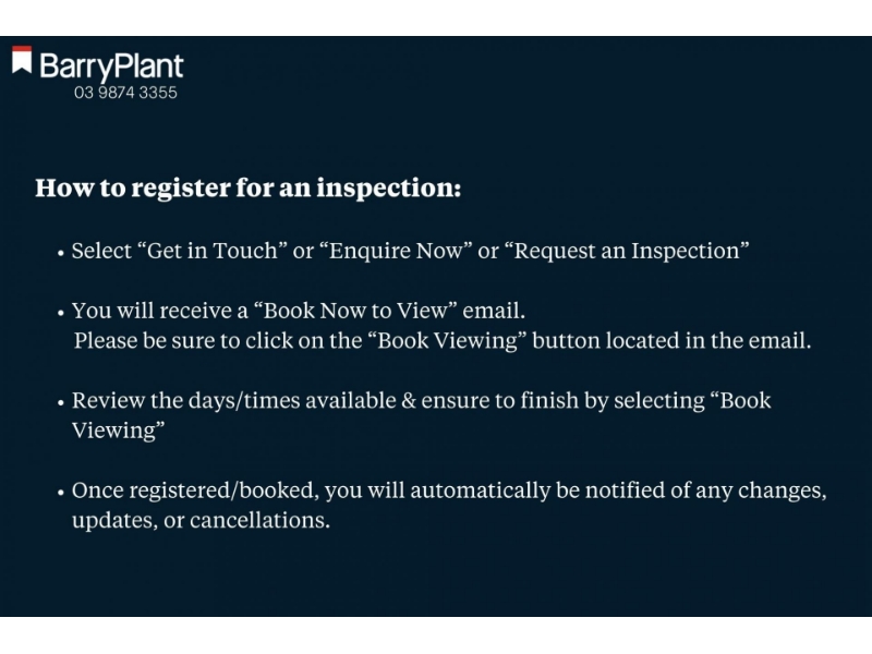 Quality apartment located on the top level of the complex, enter through the solid security front door and be refreshed by natural tones throughout the sun filled lounge, kitchen with stainless steel appliances, Caesarstone bench tops, Miele gas cooktop, dishwasher, soft close cupboards plus more. Two bedrooms with hydronic heating, master with large walk-in robe, second bedroom with double built in robes. Stylish bathroom, with floor to ceiling tiles, spacious shower with hand held shower rose. This apartment also offers L shaped balcony, intercom, split system heating and cooling and under cover secure car space just 2 parks away from the lift. This apartment is convenience at your fingertips. All this and more situated in the middle of the vibrant St Kilda precinct. Move in, relax and enjoy! Photo ID may be requested at this inspection prior to entry. INSPECTIONS: Book an inspection when it suits you, not us. To book an inspection, please click the Get in Touch or Enquire button on this listing and you will receive an email where you can select a date and time that is suitable for you. All inspection times are subject to change or cancellation. Please ensure to register your attendance to receive updates regarding the inspection status. Should we need to cancel an inspection or lease a property prior to the next scheduled inspection, we will inform you via email to ensure that you are kept well informed. APPLICATIONS: Following receipt of your enquiry via the Get in Touch or Enquire button, you will receive an email which enables you to Book Viewing or Apply Now. Should you wish, you can submit your Online Tenancy Application prior to the inspection. Please note, your application can be withdrawn following the inspection should you find that the property does not meet your needs. If you have any questions regarding this listing or any other Barry Plant properties for rent, please contact the Barry Plant Listing Agent or Property Manager.