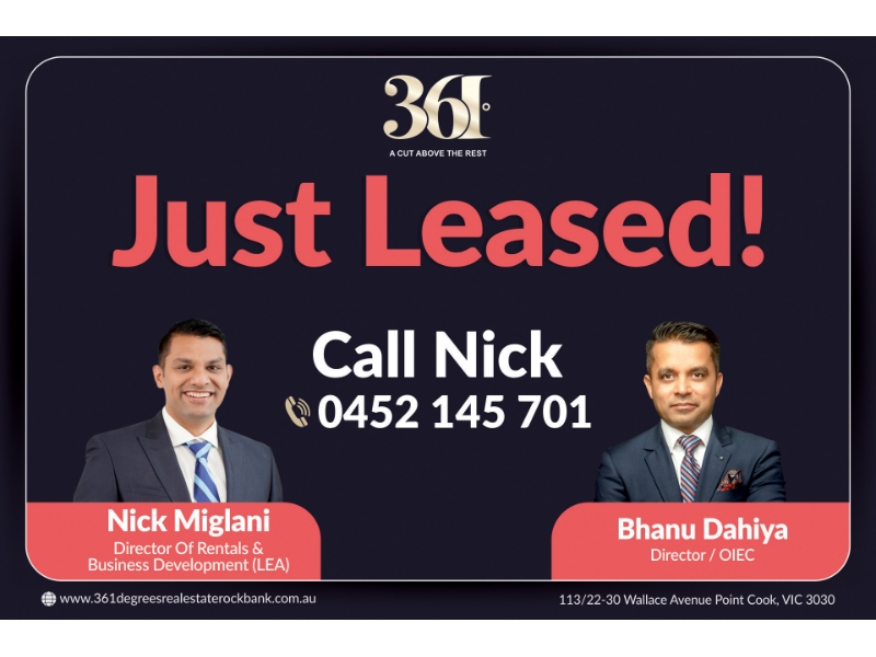 Nick Miglani & 361 Degrees Real Estate proudly present to you this near new spacious 4 bedroom home, built with high standards and featuring quality fixtures and fittings throughout, a modern colour scheme combined with open plan living and dining that flows seamlessly outdoors. * Master bedroom with walk in robe and ensuite * Three further bedrooms with built in robes * Open plan kitchen, living and dining * Two fully Functional Kitchens Rear and Front with upgraded glass appliances, ample bench space and storage * Butler's Pantry * Family bathroom with freestanding bath and shower * Double garage with auto door and internal access * Refrigerated cooling and Heating * Low maintenance front and backyard Close to Rockbank train station, Western freeway, proposed Westfield shopping centre, Child care, Day care, Primary School and parks . Approx. 10mins drive to Caroline Springs shopping centre and 30 mins drive to the CBD. Don't miss out on this fantastic opportunity! For more information, contact Nick Miglani at 0452 145 701 or email info@361realestate.com.au INSPECTIONS ARE SUBJECT TO CHANGE WITHOUT NOTIFICATION, PLEASE CHECK THE WEBSITE PRIOR TO ATTENDING THE INSPECTION PLEASE NOTE: PRESENTATION OF PHYSICAL PHOTO I.D. IS A CONDITION OF ENTRY TO VIEW PROPERTY. Please see the below link for an up-to-date copy of the Due Diligence Check : http://www.consumer.vic.gov.au/duediligence DISCLAIMER: All stated dimensions are approximate only. Particulars given are for general information only and do not constitute any representation on the part of the vendor or agent. Photos for illustration purposes only. Any school zoning stated based on www.findmyschool.vic.gov.au.