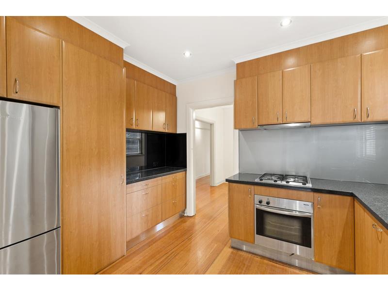 This north facing Two bedroom apartment in great location location just off Glenferrie Road and Toorak Road, with tram two minutes away. Two bedroom with built in robes, spacious living and separate dining room(not third bedroom) all with polished floorboards throughout. The kitchen has stone bench tops, Miele appliances including integrated dishwasher, stainless steel fridge and cupboard for front loading washing machine. Bathroom has Terrazzo floor, shower over bath and vanity and toilet. Gas ducted heating throughout, gas hot water and solid brick. Small very quiet block of only four apartments, with lock up garage at the rear.