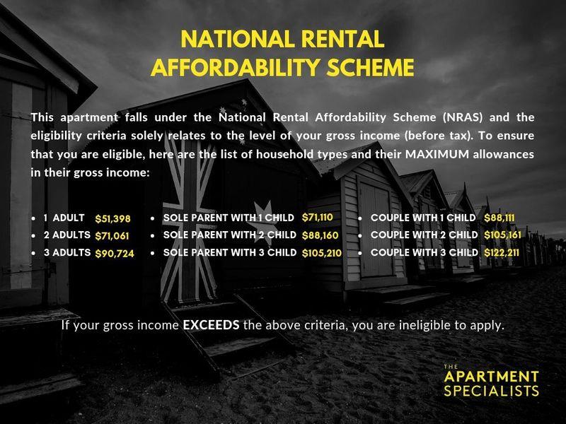 The Apartment Specialists are proud to present this immaculately near new two bedroom apartment. Ensuring an effortless low-maintenance lifestyle, the open plan, flow through layout is ideal for those who enjoy a relaxed style, indoor-outdoor living and entertaining. It boasts a gourmet kitchen equipped with SMEG Appliances, a dishwasher, and large stone bench tops. The kitchen opens into your very spacious living area with split system heating and cooling, and leads to your very own private balcony. The bathroom is equipped with beautiful frameless shower and European laundry. The apartment also features generous bedrooms with built in wardrobes. The Brunswick East location is cannot be matched; walking distance to several public transportation nodes, shopping districts, lush parklands, trendy cafés and restaurants. This is a UNIQUE and LIMITED opportunity. These apartments are only for ELIGIBLE TENANTS. These apartments are under the National Rental Affordability Scheme (NRAS) and the eligibility criteria solely relate to the level of your gross income. Should you not be able to prove your gross income, you WILL NOT be eligible to rent one of these properties. In order to be eligible for an NRAS property, your household gross (before tax) income must come UNDER your applicable household type. The following is a list of household types and their maximum allowances in their gross income: 1 ADULT - $51,398 2 ADULTS - $71,061 SOLE PARENT WITH 1 CHILD - $71,110 SOLE PARENT WITH 2 CHILDREN - $88,160 COUPLE WITH 1 CHILD - $88,111 Please register your interests by sending us an email and we will send you the NRAS Application Forms to help you apply for these apartments. If you have further questions, please call us at 9826 9908. Here is the link to download NRAS Application Forms for you to thoroughly review, fill out and to apply: ****************** Please copy & paste into your browser: https://bit.ly/2UYbRSA ****************** Book online, call 03 9826 9908 or email rentals@theapartmentspecialists.com.au to register for an inspection. ***By registering your details, you will be instantly informed of any updates, changes or cancellations for your property appointment. Without a booking you will not be able to view the apartment.***