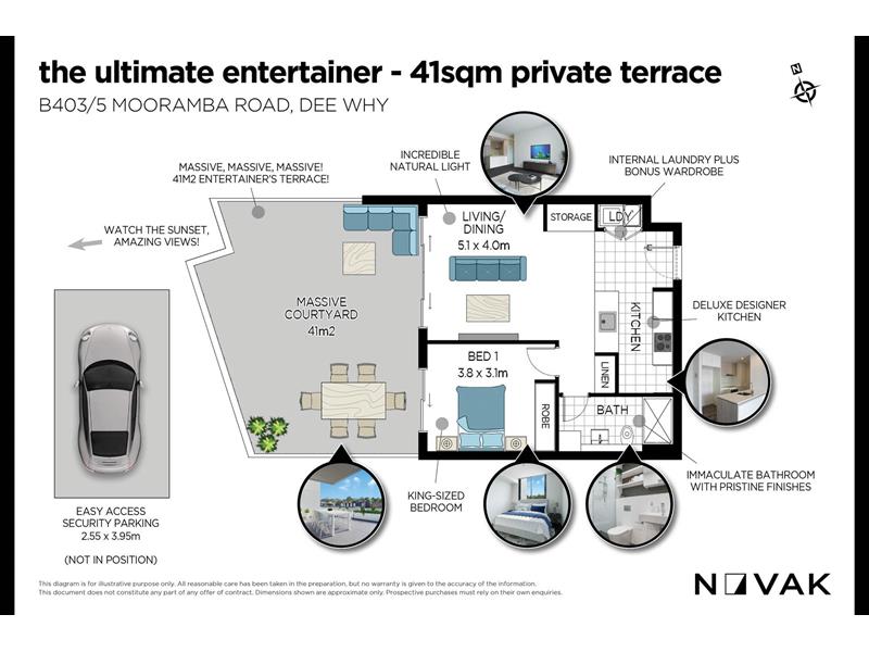 PROPERTY HIGHLIGHTS: | Exceptional 1-bedroom space | In the near-new "Osprey" building | Situated at the quiet rear of the block | Bright open plan living and dining area | Doors flow to huge sunny entertaining balcony | Gourmet kitchen with stone benchtops | Ilve gas cooktop and dishwasher | Two built-in storage cupboards | Queen size bedroom with built-in robe | Sleek modern bathroom | Internal laundry with dryer fitted | Use of huge communal gardens, BBQ area | 1 secure car space with lift access GREAT LOCATION, CLOSE TO: | Local shops and eateries | Dee Why beach & cafe strip | Public transport- express bus to the city PROPERTY HANDY FACTS: | 12 months lease | No Pets ||| THE NOVAK PROPERTIES DIFFERENCE |||