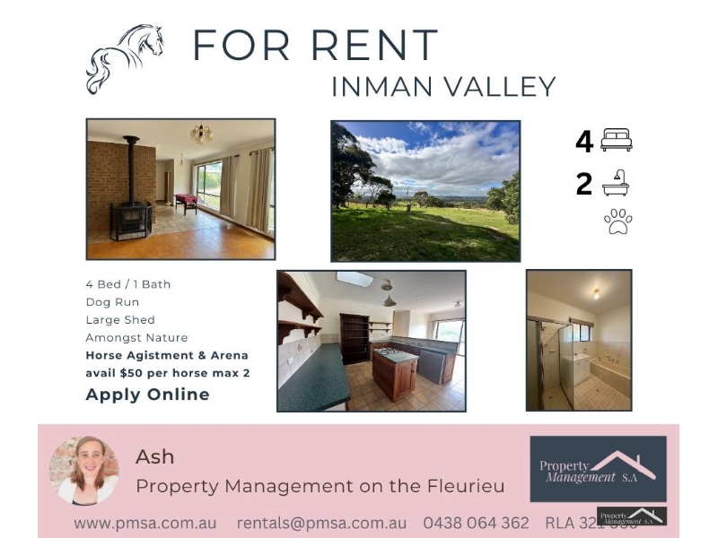 Welcome to the hidden gem of Inman Valley! This charming rental house is ready to offer you a dreamy lifestyle with its picturesque surroundings and secluded location. With 4 bedrooms or 3 + a Study and 2 bathrooms, there's plenty of room for you and your loved ones to spread out and relax. - 4 Bedrooms (or 3 + a Stud) - 2 Bathroom (with Bath) - Kitchen with Gas cook top - Large Shed included - Dog yard/run - Fireplace - RC AC - Horse agistment (max 2 horses) & arena facilities available at extra cost ($50 per horse) - House yard included in the lease (dog run and 1 x Large Shed). Paddocks and Arena excluded unless negotiated. - APPLY ONLINE - AVAIL NOW So, whether you're looking for a peaceful retreat or a place to be with your horses/furry friends, this rental house ticks all the boxes. Don't miss out on this opportunity – secure your spot today! Property Management S.A Pty Ltd RLA 321 959 www.rentals@pmsa.com.a rentals@pmsa.com.au 0438064362