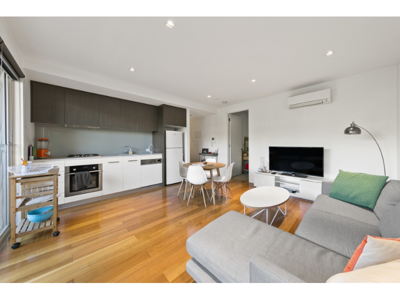 Enviably situated in quiet locale yet only moments from Bridge Roads shops and restaurants, Church street and trams to the city, this ultra-stylish architect designed ground level apartment delivers sensational lifestyle appeal. The inviting contemporary ambience is enhanced by full width glass and timber floors in the open plan living and dining room with sleek designer kitchen featuring stone benches. Living extends out to a private covered courtyard with its own secure street access, perfect for outdoor dining. The spacious bedroom with built in robes includes a stunning ensuite. In the highly acclaimed Cubo complex, it also includes split system heating and cooling, panel heating, Euro-laundry, storage cage and secure basement car-space.
