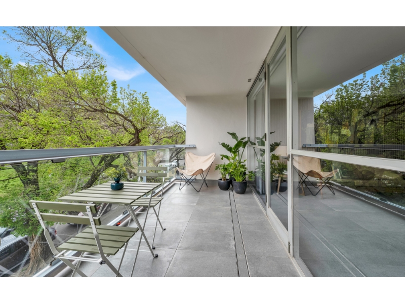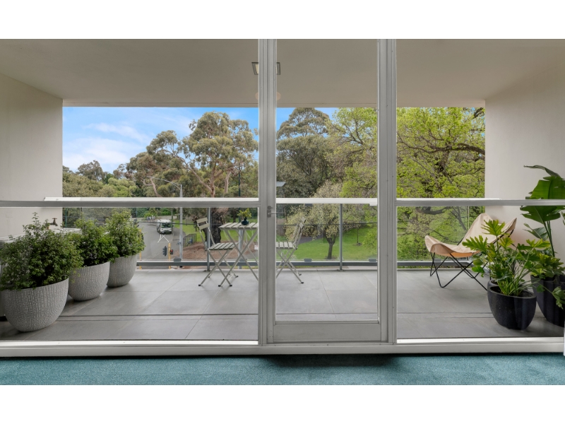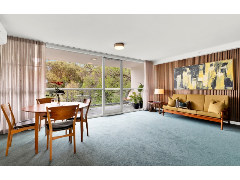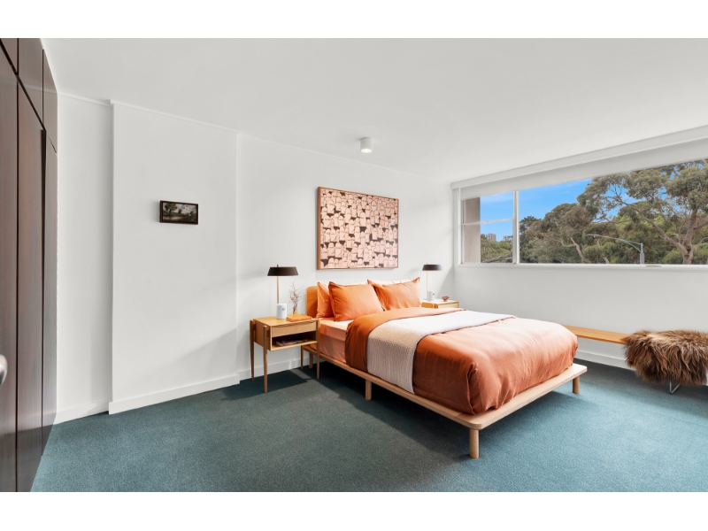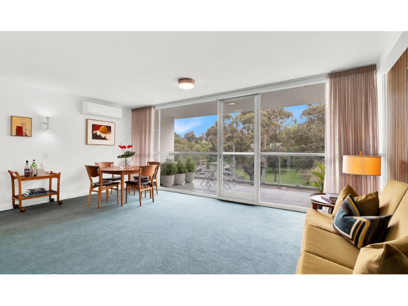 A landmark of Melbourne’s modernist era, Domain Park (c1962), designed by the renowned architect Robin Boyd, stands proudly opposite the Royal Botanic Gardens in one of the city’s most coveted locations. An immensely welcoming foyer, exuding the calm sophistication of the 1960s, greets you on arrival. Situated on the second level of the western tower, this beautifully renovated modernist apartment captures exceptional light and sweeping views from every room - a hallmark of Boyd’s timeless design. The layout features a generous entry hall leading to a spacious north-facing living room that opens to a balcony with leafy garden vistas. The new updated kitchen which includes an integrated refrigerator, with its original charm thoughtfully retained, connects seamlessly to the living area and enjoys elevated views over the rooftops of Park Street. Two double bedrooms each include built-in robes, while the well-proportioned bathroom offers a separate shower, bath, and W/C. Additional comfort is provided by air conditioning and undercover car space and visitor parking. Residents enjoy the convenience of lift access, and the reassurance of a resident building manager. The building’s enduring appeal lies in its harmonious blend of mid-century design and contemporary living, offering an atmosphere of extraordinary charm and calm. Perfectly positioned moments from Domain Road’s vibrant cafés and boutiques, Fawkner Park, the St Kilda Road arts precinct, and excellent public transport, this apartment represents a rare opportunity to live within one of Melbourne’s most admired architectural landmarks. **If this property is of interest to you, please ensure that you register your interest by clicking on the 'Get in touch' button, so that you are kept up to date with inspections, price changes and similar properties that may be suitable. We assure you that your details remain confidential and are only used for the purpose of securing you a property. https://kayburton.com.au/privacy-policy **